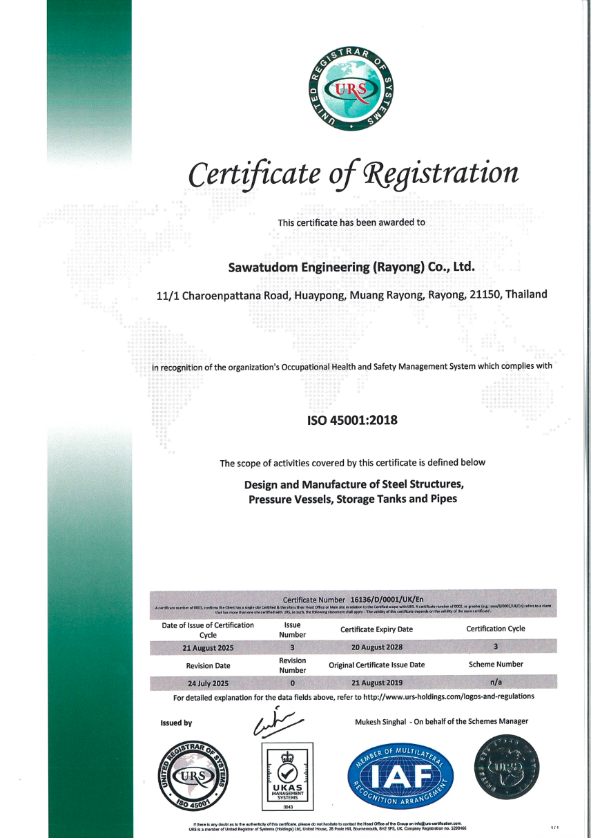 ISO 9001, ISO 14001, ISO 45001, ASME U, S, AND R STAMPS RECOGNIZED,INCLUDING CSR:DIW AND TTM (THAILAND TRUST MARK).